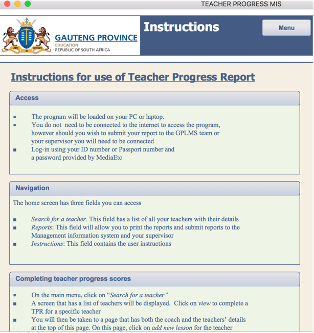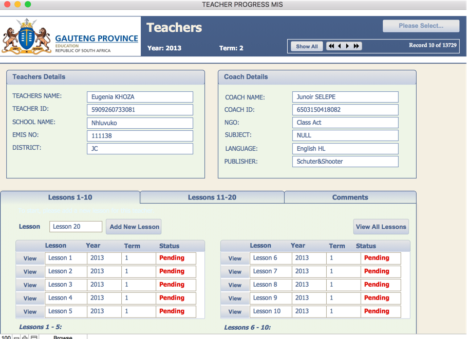 This database was built for coaches, enabling them to monitor teachers lessons and their progress.